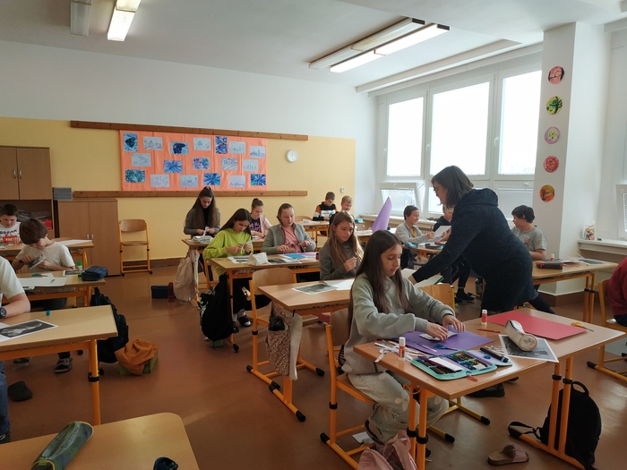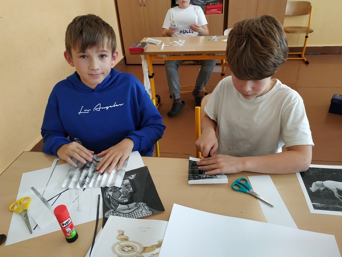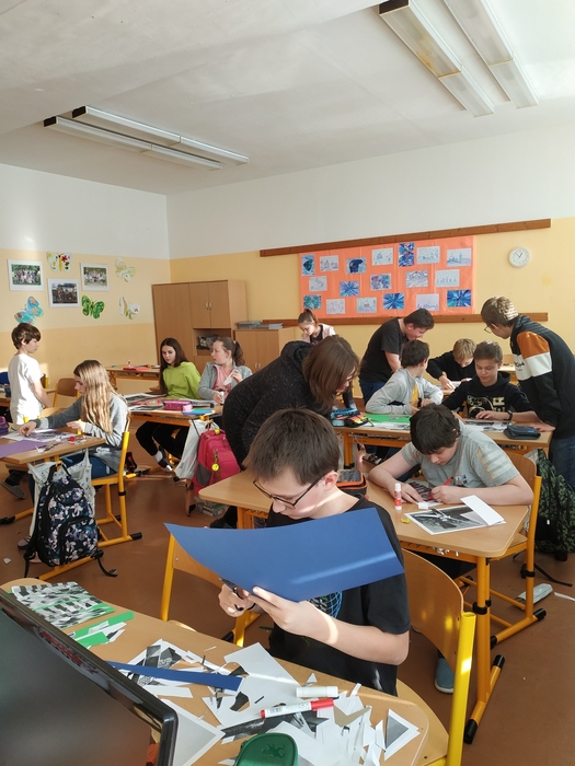 Žáci 7. třídy dnes prožili edukační program s paní edukátorkou Třinecké galerie Veronikou Chmelařovou. Téma bylo Koláže Jiřího Koláře. Žáci získali nejen nové vědomosti, ale hlavně si i své vlastní koláže a mnohdy i roláže vytvořili. Práce je velmi bavila a už se těší i na návštěvu Třinecké galerie.